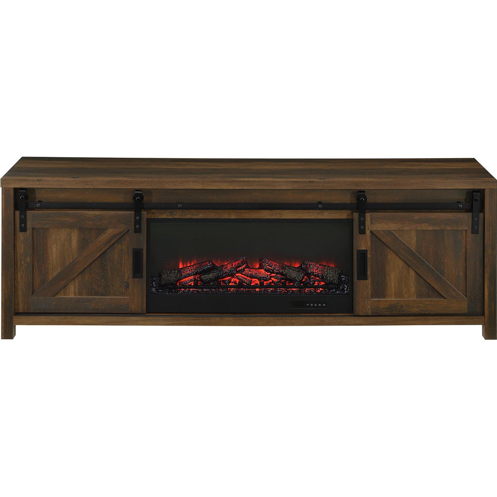 • Fireplace TV stand in dark pine finish with black metal accents and sliding barn-style doors